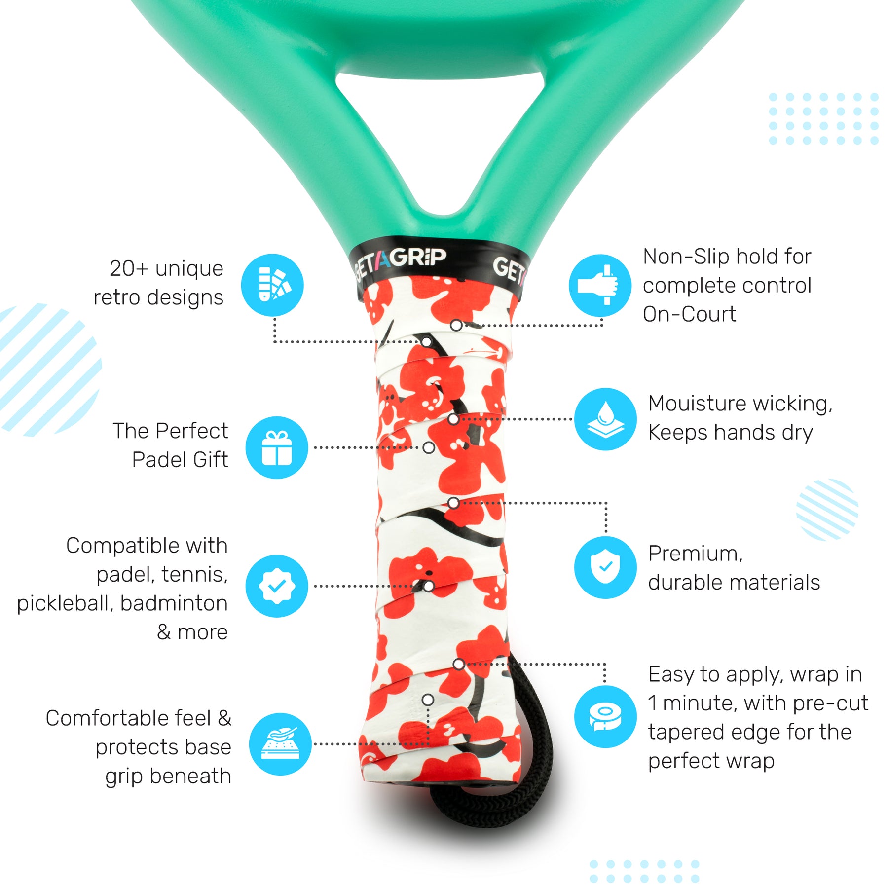 • Premium material - only content with the best, Get A Grip padel racket overgrips are made with quality durable material for long-lasting performance.